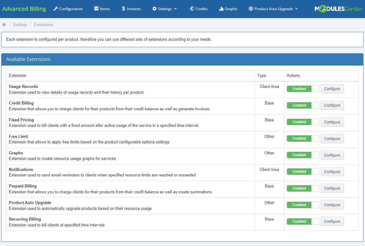 | As you might have already noticed, a new tab dedicated to the extension appeared on your Advanced Billing For WHMCS module main menu. Under this section there is located the whole management of the extension. Let's move to 'Configuration' firstly. |