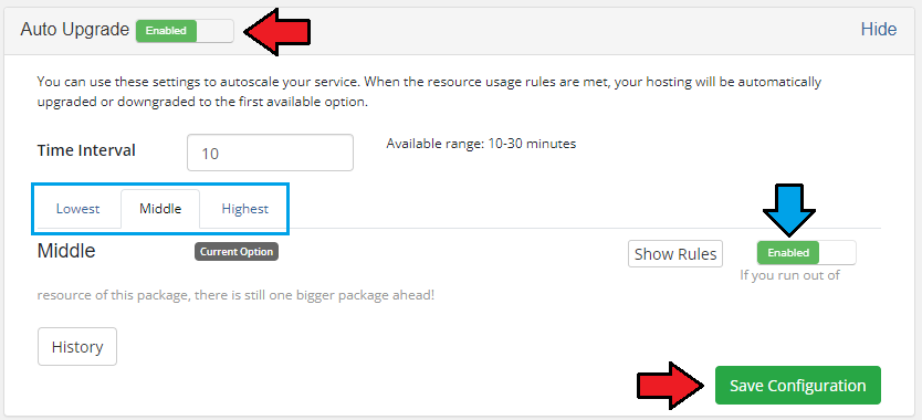| Besides the management of autoscaling, you can view the history of switches made on a hosting through pressing 'History'. |