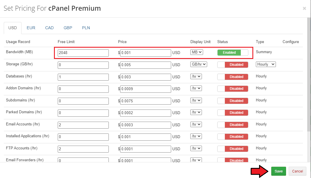 | 2. Go to 'Products List' → (your product's) 'Settings' → 'Credit Billing' and press 'Enable'. Afterwards, enter '1' into 'Create Invoices Each', '20' into 'Minimum Credit' and '50' into 'Low Credit Notification'. |