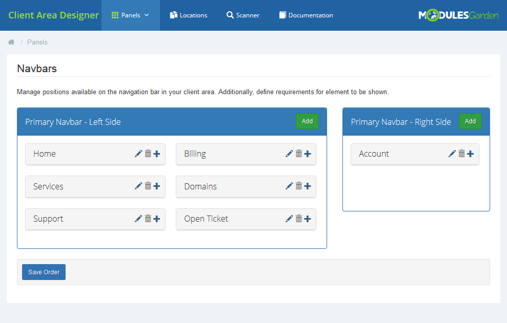 | Client Area Designer For WHMCS is a module which allows you to adjust the layout of any panels available on your client area as well as add new widgets. The module does not require highly advanced configuration. |