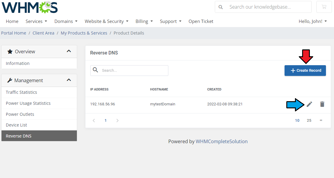 | Your clients have the ability to manage their reverse DNS records. They can either modify existing records or create new ones. |
