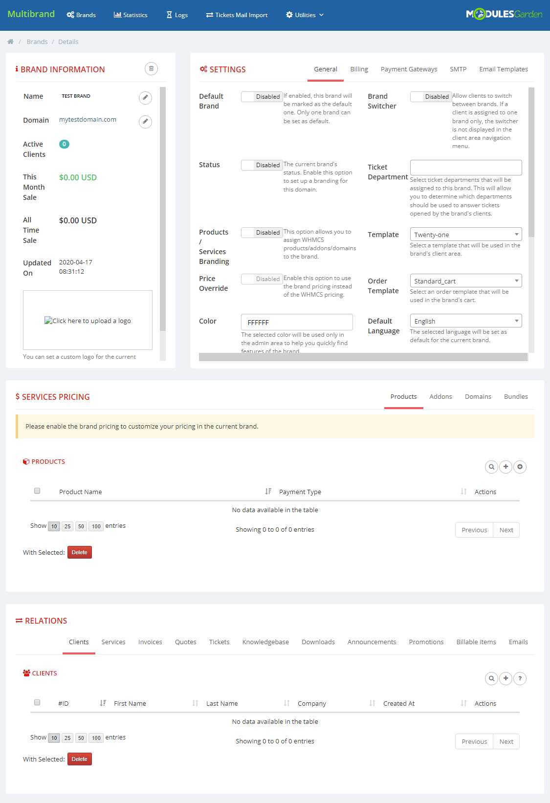 The module will allow you to easily personalize each brand by adjusting its client area template, logo, language and many other elements. |