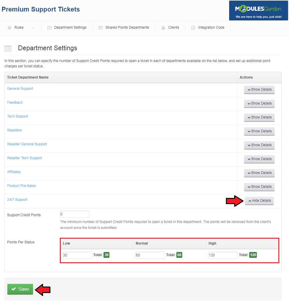 Note: If you want, you can also not configure any Dedicated Points credits in the module, so all clients will only use their Shared Points freely for all chosen departments.
