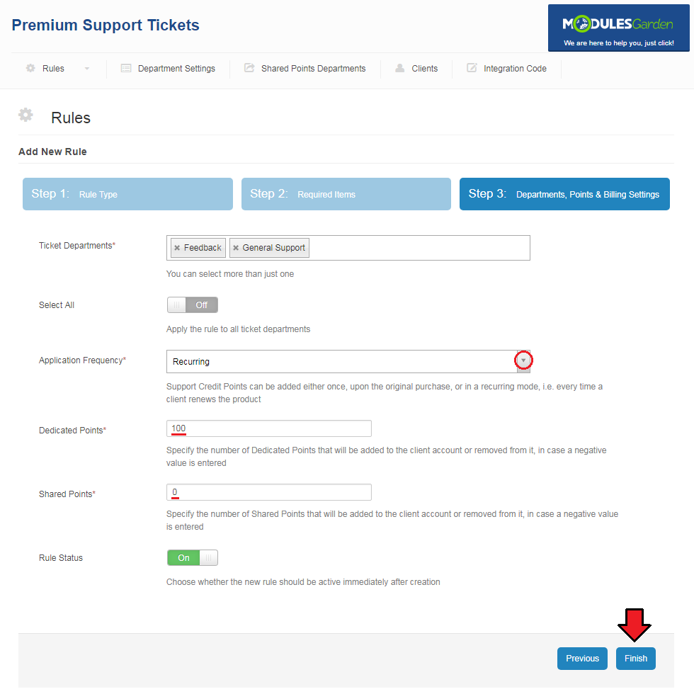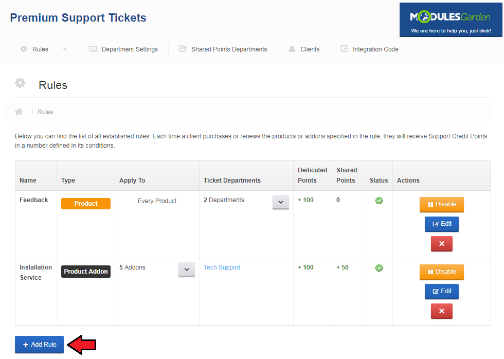 Rules section defines which products or product addons your clients can receive Support Credit Points for.