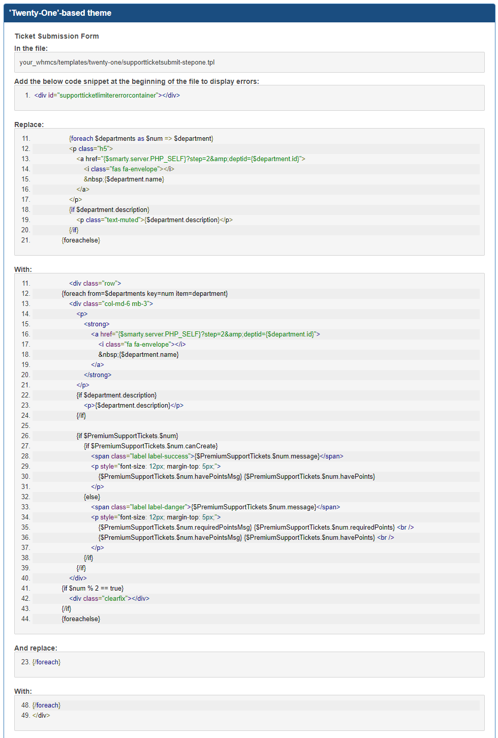 8. Proceed to 'Addons' 'Premium Support Tickets' 'Integration Code' and follow steps listed there to apply code snippets to the theme you are using