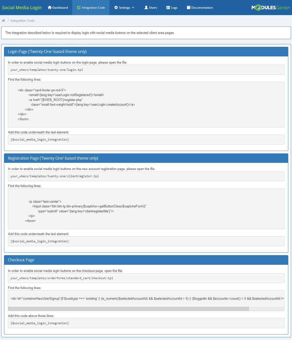 | Social Media Login For WHMCS brings modern, user-friendly and common solution to your WHMCS to make the usage more enjoyable for your clients. Underneath, you will find a complete guide which will show you how to take full advantage of the module. |