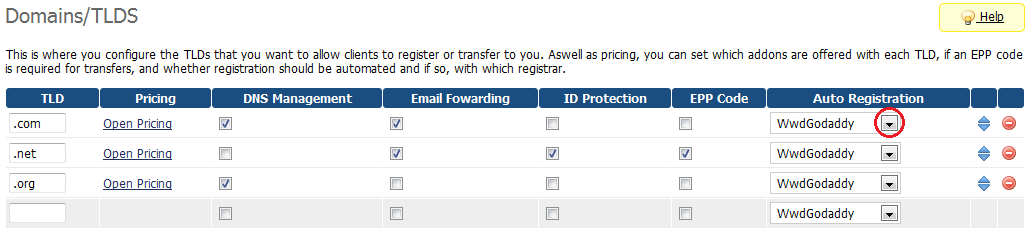 | 6. Update domain pricing through choosing 'WwdGoDaddy' from an 'Auto Registration' dropdown menu. |