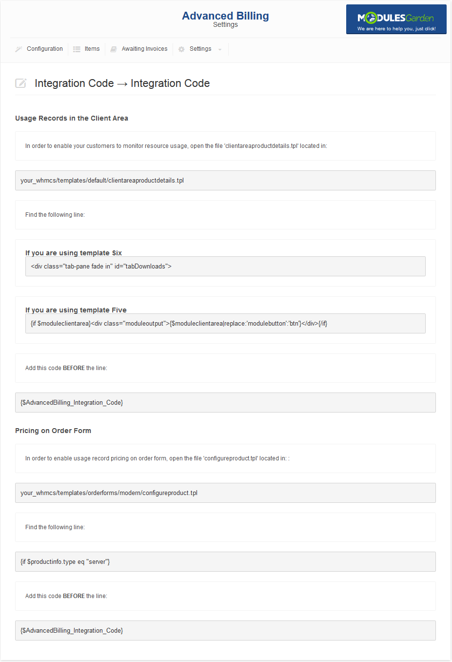 | Integration code allows displaying usage records for each of your customers in the client area and allows to display pricing on the order form. Important: Editing clientareaproductdetails.tpl of classic or portal template goes a bit differently than shown on the screen below. <div align="center">{$moduleclientarea}</div>