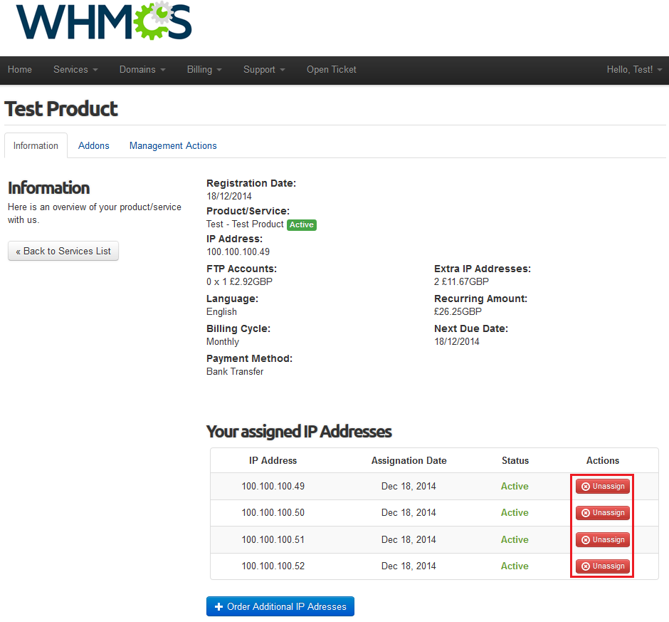 Module allows your customers to view IP addresses assigned to their product any order new ones.